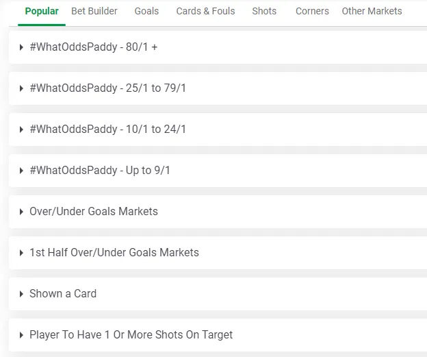 Paddy Powerでは人気のベットビルダーの組み合わせも表示される