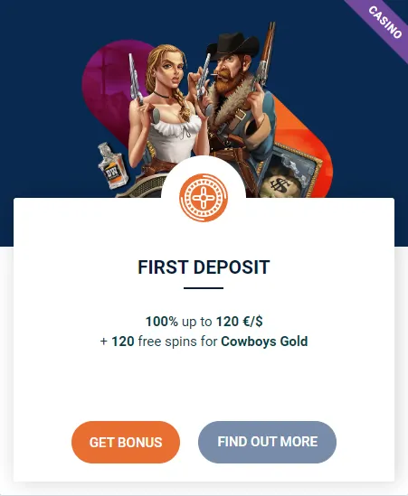 初回入金カジノボーナス:100%(最大120ユーロ+フリースピン120回)